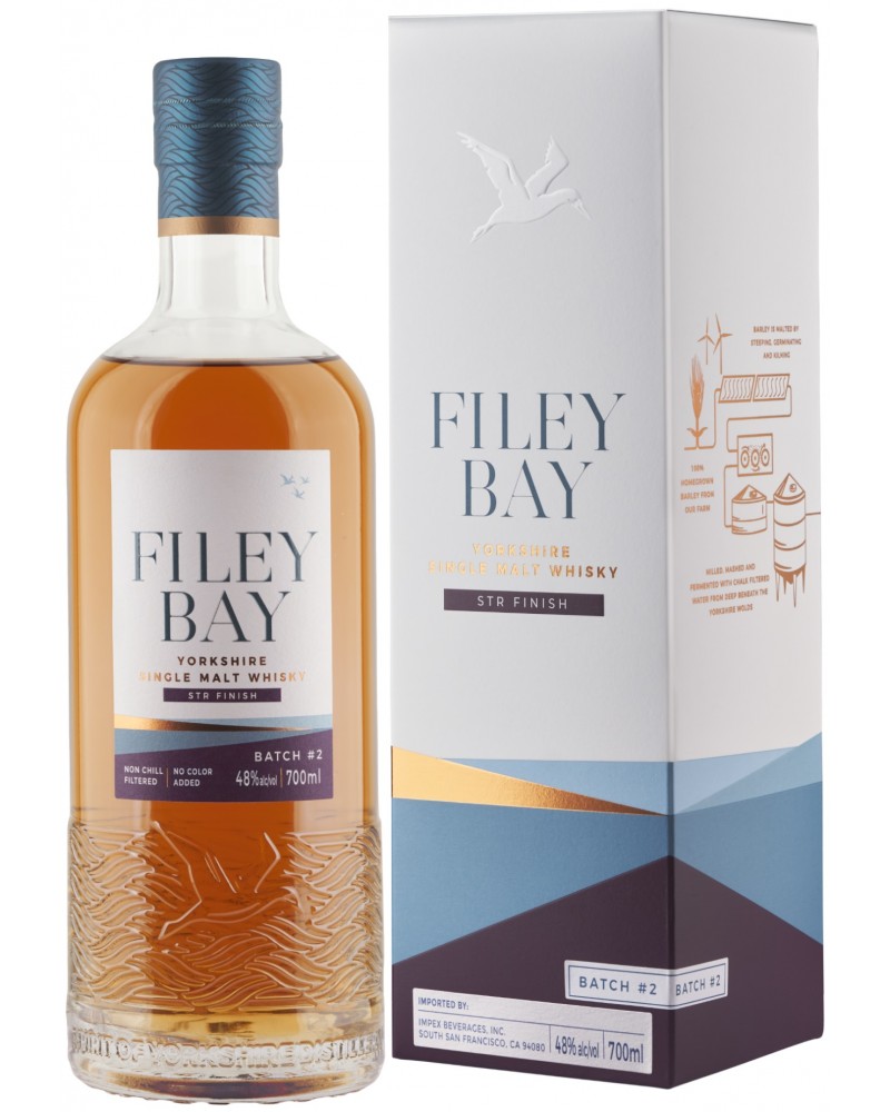 Filey Bay STR Finish spent years maturing in Bourbon casks before being transferred for ‘finishing’ in shaved, toasted and re-charred (STR) red wine Barriques, which came from sunny Rioja vineyards in Spain, then bottled at 48% alc.