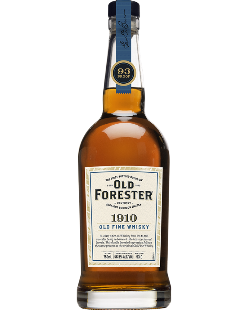 Today mimicking this historic bottling, this unique expression of Old Forester has undergone a second barreling, granting it exceptional character, a smooth and sweet flavor and a clean, crisp finish. Entering the second barrel at a low 100 proof allows more of the sweet wood sugars to dissolve into the whiskey. 1910 Old Fine Whiskey is the fourth and final expression of the Whiskey Row Series, presented at 93 proof.